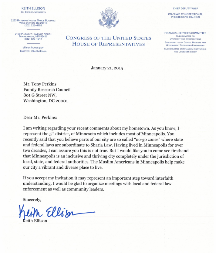 Rep. Ellison, whose 5th District covers Minneapolis, responded with an assurance that “this is not true,” and invited Perkins to visit the city and see that Minneapolis is “an inclusive and thriving city completely under the jurisdiction of local, state and federal laws.” Ellison offered to arrange meetings with local and federal law enforcement and community leaders to help Perkins take “an important step toward interfaith understanding.”