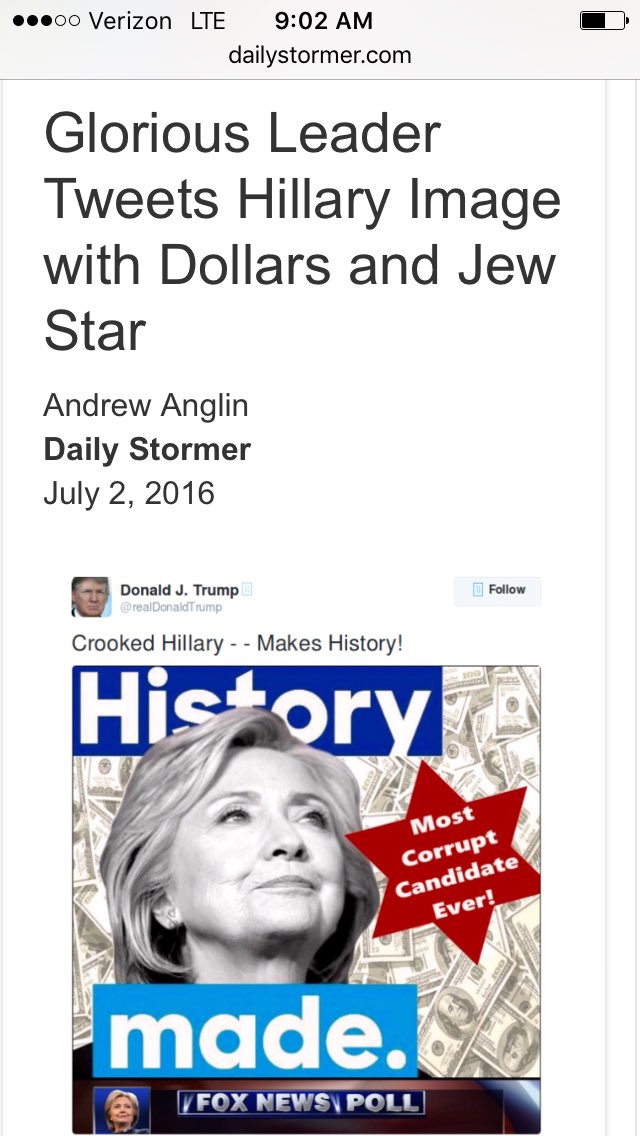 (with comments)] Senior Polling Editor Natalie Jackson received this tweet from a Trump supporter. I received this tweet after tweeting a photo of Trump’s face photoshopped onto a Cheeto. HuffPost staffers have received some vile, anti-Semitic messages. 07/19/2016 http://www.huffingtonpost.com/entry/trump-antisemitism-reporters-threats_us_577e1b58e4b0344d514dfc58 [with embedded video, and comments]
