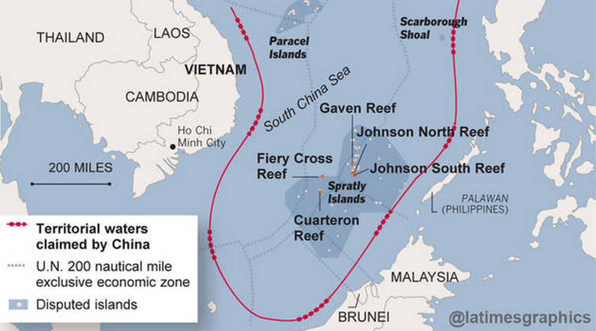 Tensions over the South China Sea, a body of water at the center of an international territorial tussle, reached new highs Tuesday Oct. 2015] after a U.S. Navy ship sailed through contested waters .. http://www.ibtimes.com/south-china-sea-dispute-us-ambassador-summoned-beijing-after-american-ship-sails-2158252 .. near the chain of Spratly Islands. The long-disputed islands, which are occupied by Vietnam, Taiwan, Philippines, Malaysia, China and Brunei, started getting some new, unwanted neighbors last year after Beijing began building artificial islands in the Sea to house military bases.