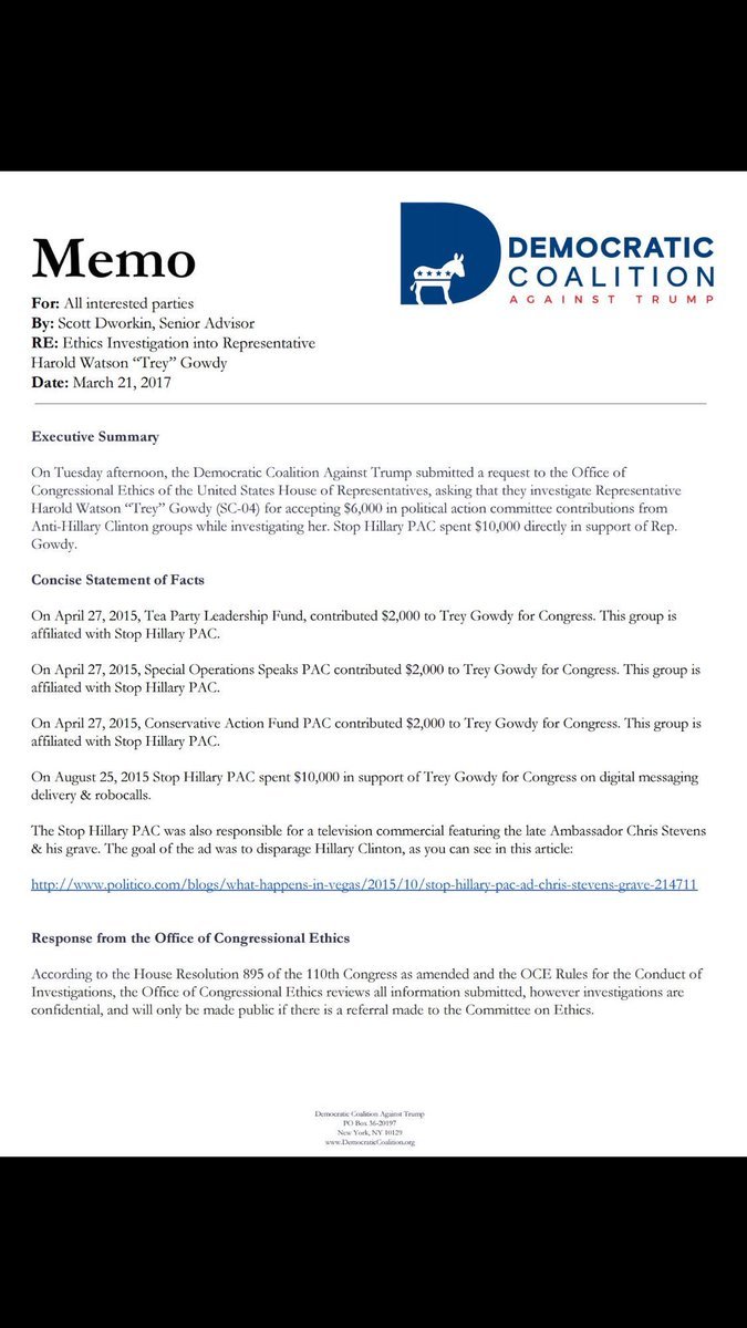 Here is the House Ethics Complaint I filed on Rep. Trey Gowdy for taking Anti-Hillary group bribes, while investigating her.