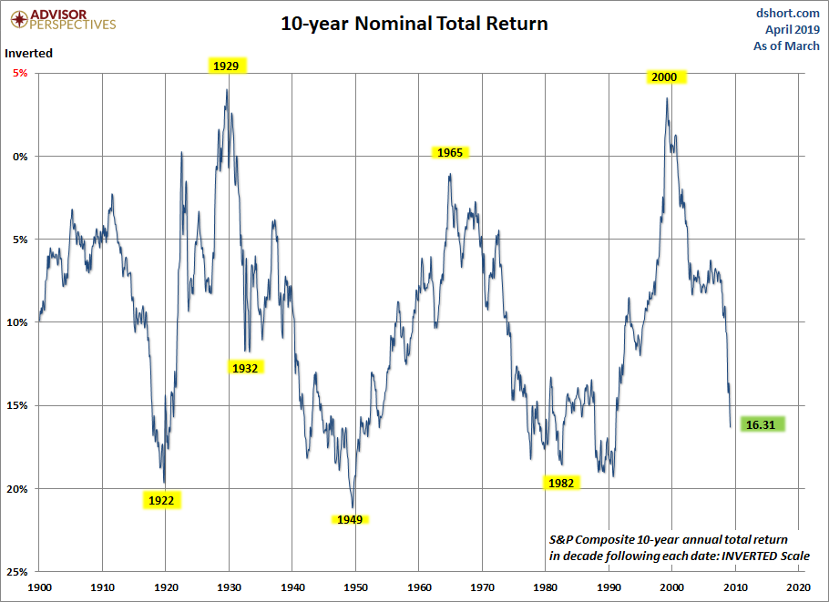 Points of ‘secular’ undervaluation such as 1922, 1932, 1949, 1974 and 1982 typically occurred about 50% below historical mean valuations, and were associated with subsequent 10-year nominal total returns approaching 20% annually. By contrast, valuations similar to 1929, 1965 and 2000 were followed by weak or negative total returns over the following decade. That’s the range where we find ourselves today. Of course, we also won’t be surprised if the S&P 500 ends up posting weak or negative total returns in the 2007-2017 decade, which would require nothing but a run-of-the-mill bear market over the next couple of years. - John Hussman