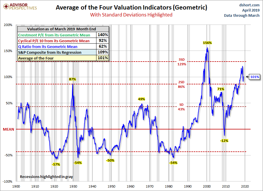 The next chart gives a simplified summary of valuations by plotting the average of the four arithmetic series (the first chart above) along with the standard deviations above and below the mean.