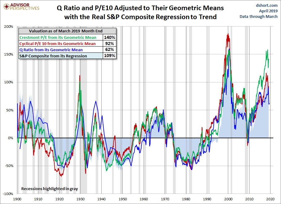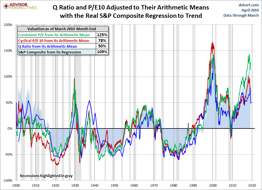 To facilitate comparisons, we've adjusted the two P/E ratios and Q Ratio to their arithmetic means and the inflation-adjusted S&P Composite to its exponential regression. Thus the percentages on the vertical axis show the over/undervaluation as a percent above mean value, which we're using as a surrogate for fair value. Based on the latest S&P 500 monthly data, the market is overvalued somewhere in the range of 50% to 125%, depending on the indicator, down from 67% to 127% the previous month.