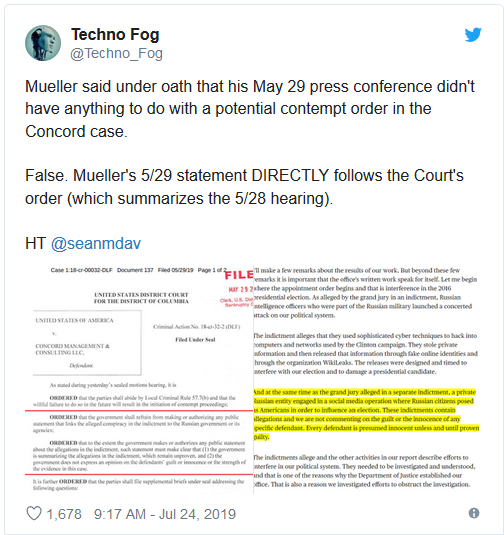 On May 29, Mueller gave a 9 minute press conference where he defended the Russian companies indicted and said they are presumed innocent until proven guilty — in other words, Mueller was following Judge Friedrich’s order.