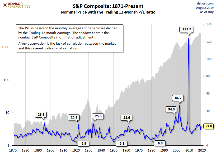 A standard way to investigate market valuation is to study the historic Price-to-Earnings (P/E) ratio using reported earnings for the trailing twelve months (TTM). Proponents of this approach ignore forward estimates because they are often based on wishful thinking, erroneous assumptions, and analyst bias.