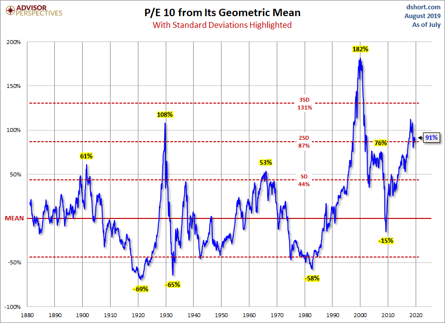 The chart also includes a regression trendline through the P/E10 ratio for the edification of anyone who believes the price-earnings ratio has naturally tended higher over time as markets evolve. The latest ratio is 50% above trend, up from 46% above last month.