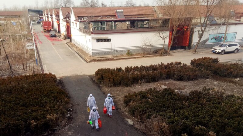 Here, volunteers in protective suits deliver daily supplies to people who are under self-quarantine at a village in Shandong province, China.