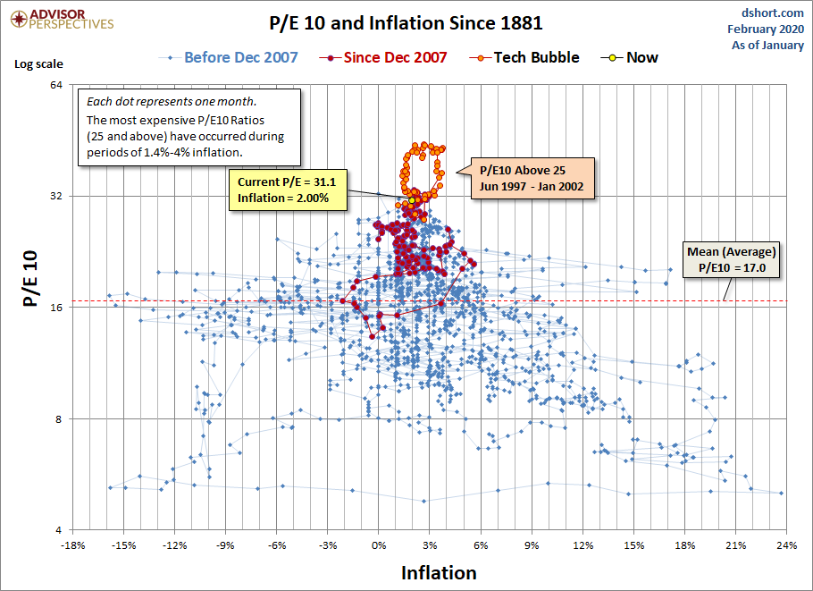 Here is a scatter graph with the market valuation on the vertical axis (log scale) and inflation on the horizontal axis. It includes some key highlights: 1) the extreme overvaluation and irrational period of the Tech Bubble, 2) the valuations since the start of last recession, 3) the average P/E10 and 4) where we are today.