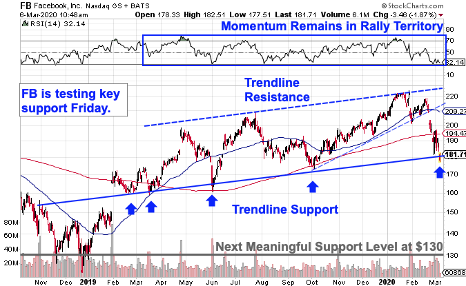 While Facebook kicked off 2020 on a solid note, in an uptrend that stretched back to October, that rally ended in February when shares closed below $205 for the first time. That, in turn, opened up about 12% downside risk as shares retraced down to longer-term support at the $180 level.