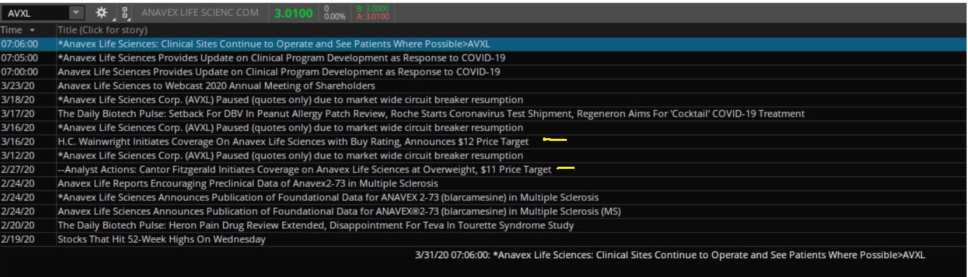 AVXL up 10%. $12pt-Multiple-Sclerosis-&-Parkinson. Parkinson data any time now. Anavex Life Sciences to Webcast 2020 Annual Meeting of Shareholders for April 7th https://finance.yahoo.com/news/anavex-life-sciences-webcast-2020-120010671.html Anavex Life Sciences Announces Publication of Foundational Data for ANAVEX®2-73 (blarcamesine) in Multiple Sclerosis (MS) https://finance.yahoo.com/news/anavex-life-sciences-announces-publication-120010207.html Anavex Life Sciences Announces Fast Track Designation Granted by U.S. FDA for ANAVEX®2-73 (blarcamesine) Clinical Development Program for the Treatment of Rett Syndrome https://finance.yahoo.com/news/anavex-life-sciences-announces-fast-120010290.html https://charts.stocktwits.com/production/original_203726385.jpg https://finviz.com/chart.ashx?t=AVXL&ty=c&ta=1&p=d&s=l