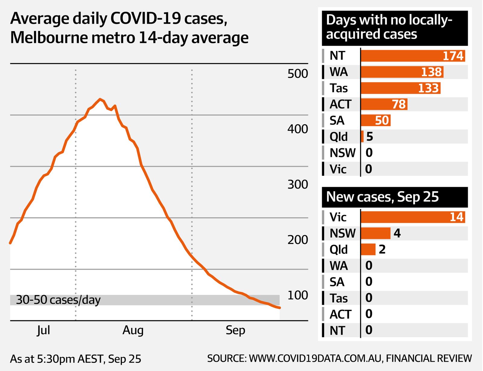 His mooted move is in response to infection numbers dropping down to what health authorities hope will be manageable levels while a national reopening process continues. The drop in Victoria’s infection rate to 14 new cases in the 24 hours to Friday morning marks a huge difference from figures that hovered around 700 a day just six weeks ago.