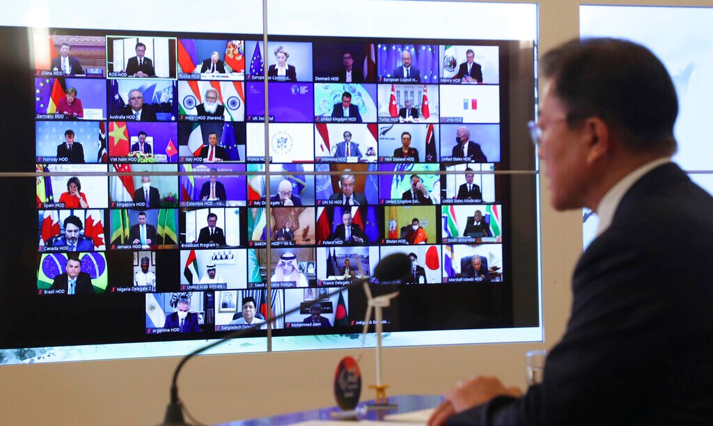 South Korean President Moon Jae-in joins in from the presidential Blue House in Seoul.(AP via Yonhap: Lee Jin-wook)