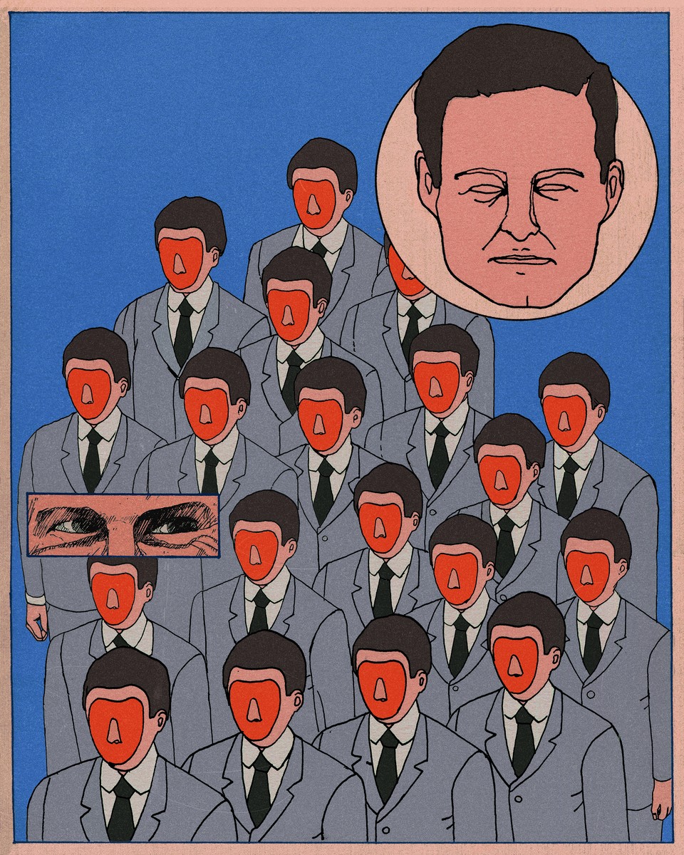 [John McEntee's face with Trump's eyes peering over a group of loyalists in suits] Toma Vagner