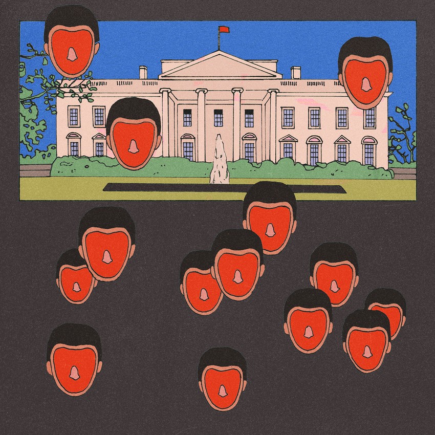 [illustration of red faces of Trump loyalists swarming the white house] Toma Vagner