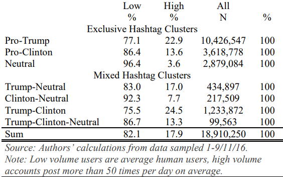CCP define high automation as "accounts that post at least 50 times a day" using at least one of the election specific hashtags. The study considers anything below that threshold low automation---in other words, a real person. The table shows a much higher percentage of low level automation, indicating much higher numbers of regular users are interacting.