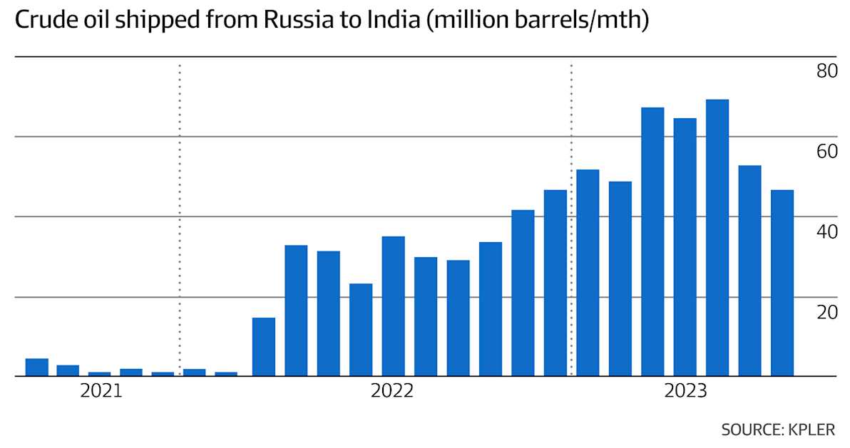 Figures from Argus, a pricing agency, also point to a large spread. Argus estimates that the average price of Urals crude has been $US14.90 per barrel higher in India than in the Baltic since data started to be collected in February.
