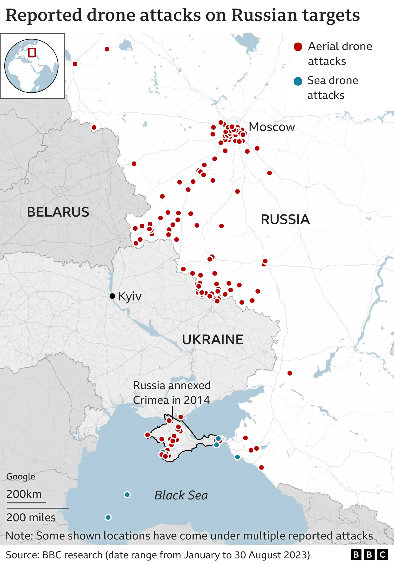 In 2023 so far, drone attacks have been concentrated in the Bryansk, Belgorod and Kursk regions in Russia near the western border with Ukraine, as well as in Russian-annexed Crimea.