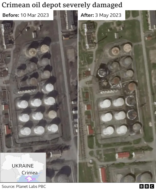 We have identified at least nine reported drone attacks on oil depots. One of these was in Sevastopol, a major city in Crimea, which was hit on 29 April, destroying several of its oil tanks.