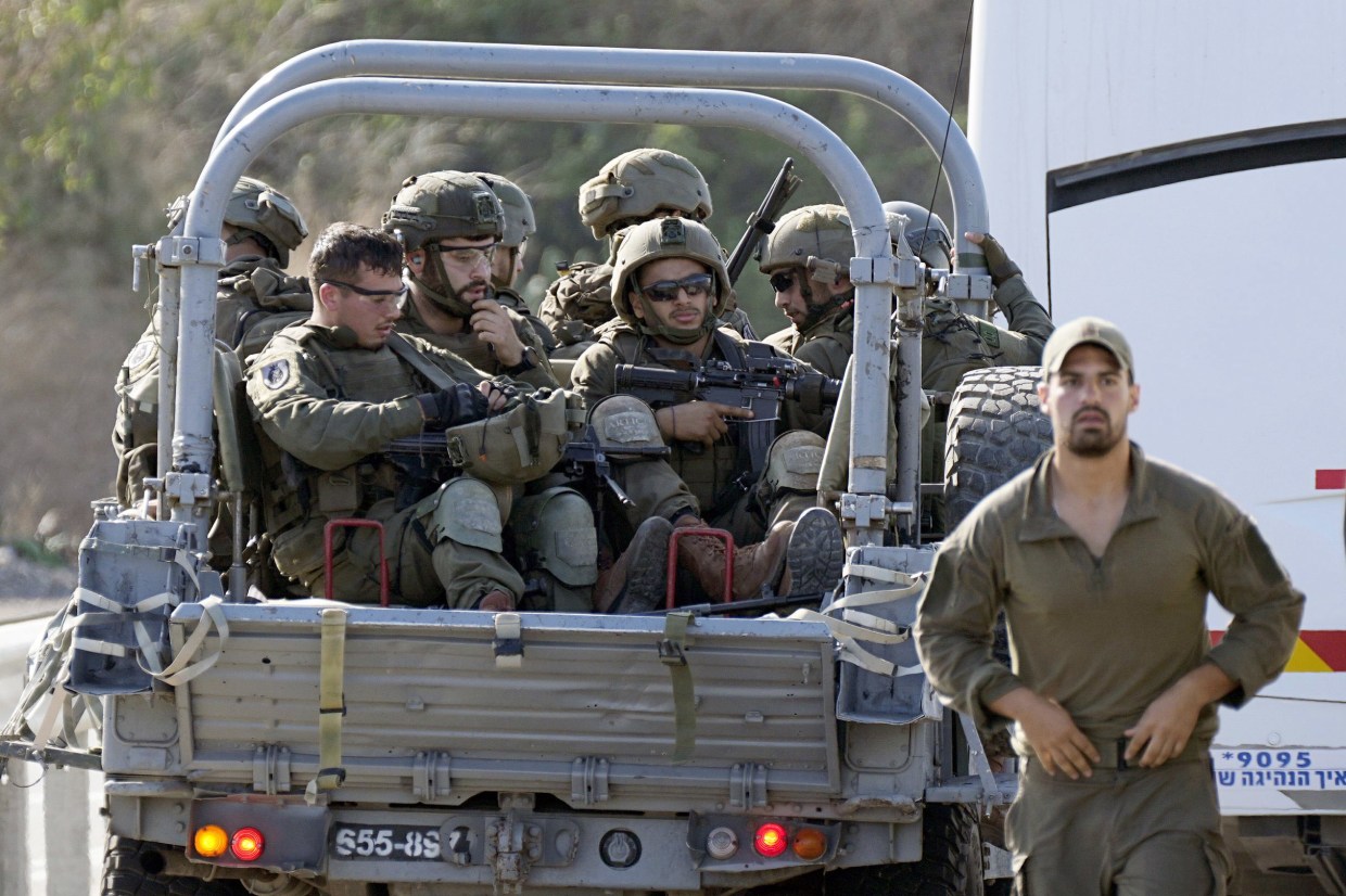 Israeli soldiers head south from Ashkelon on Saturday. Ohad Zwigenberg / AP