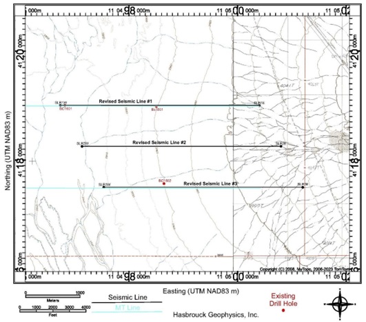 There will be an 11.0 line-km two-dimensional (2D) reflection seismic survey along three lines over a portion of the Bonnie Claire, Nevada claims. The reflection seismic survey will map stratigraphy, bedrock topography, structures within the sediments and bedrock, and the dip, continuity, and extent of aquifer units.