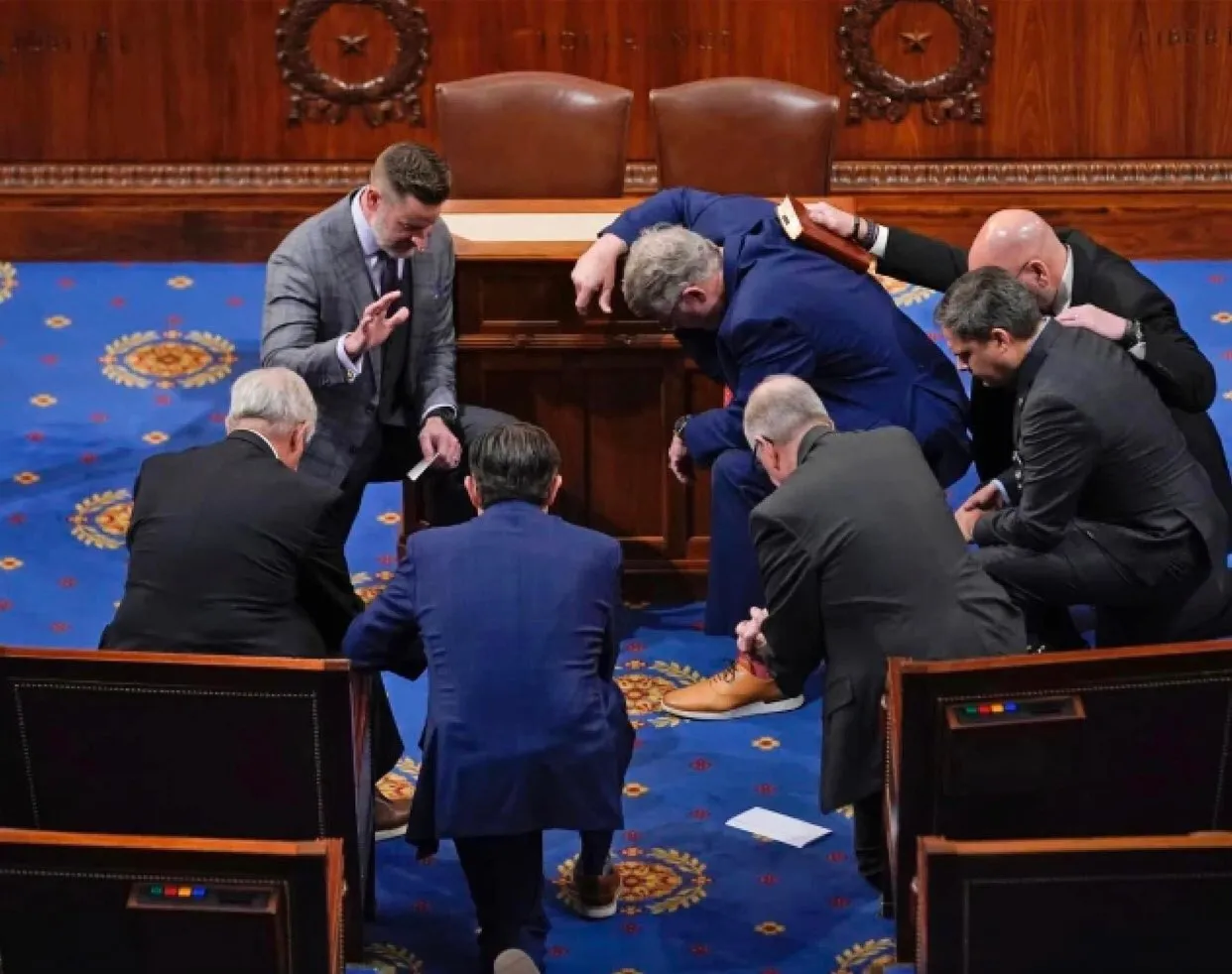 right up top: check out Mike and his pals, immediately following his grasping of the gavel. no, they’re not shooting craps — they’re praying.