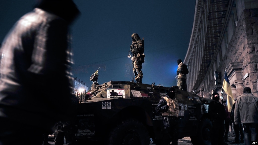 Ukraine -- Maidan self-defence activists stand on an armored vehicle in central Kyiv, February 23, 2014