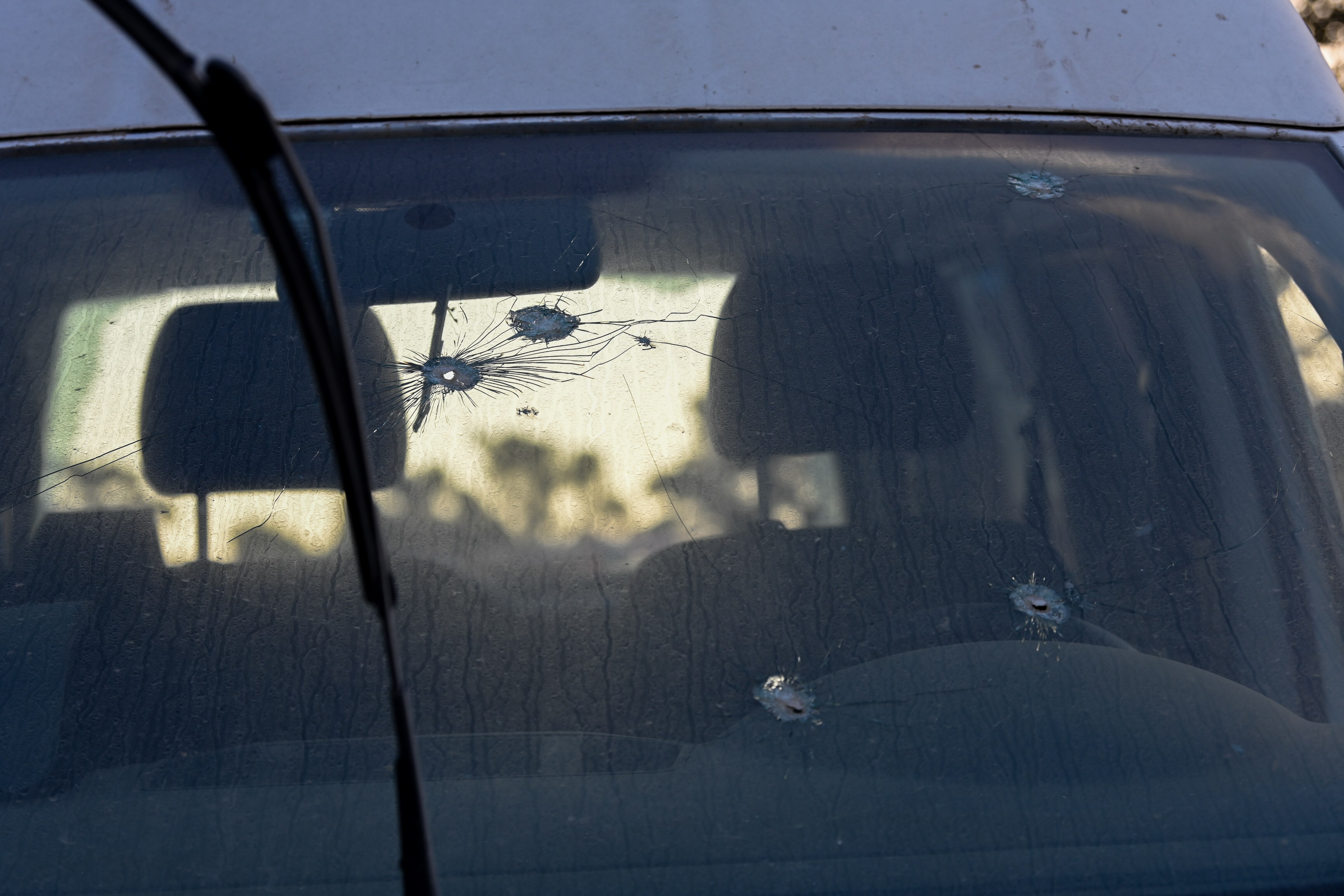 Bullet holes in the windshield of a car at the site of Israel's Supernova Music Festival that was attacked by Hamas on October 7. Getty Images: Alexi J. Rosenfeld