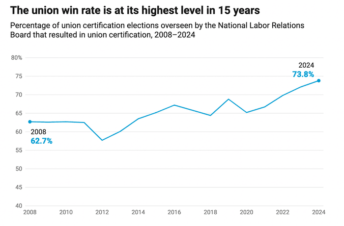 Analyzing NLRB elections data, CAP found that workers in 2024 have a better chance of winning union representation than at any point in the past 15 years, with the agency recording a 73.8% win rate—the first time in 15 years that a 70% victory rate has been surpassed.
