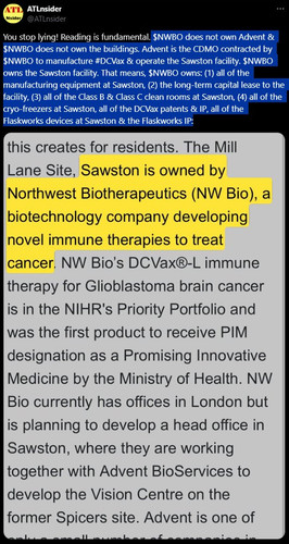 The poster’s claim that “NWBO does not own the cleanrooms or the freezers” and does not “own the manufacturing” in the sense of a GMP-approved facility reflects a nuanced reality of NWBO’s operational structure rather than a straightforward lack of ownership or control.