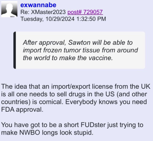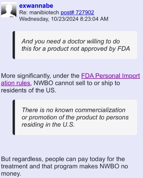 That is not correct. Because FDA has a ruleset called PERSONAL IMPORTATION, under which citizens and NWBO HAS the possibility of creating a logistical pathway for importing cells into the UK, make DCVax-L and ship back.