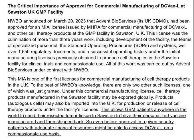 Nwbo has mia certification through advent bioservices for manifactoring of dcvax-l
