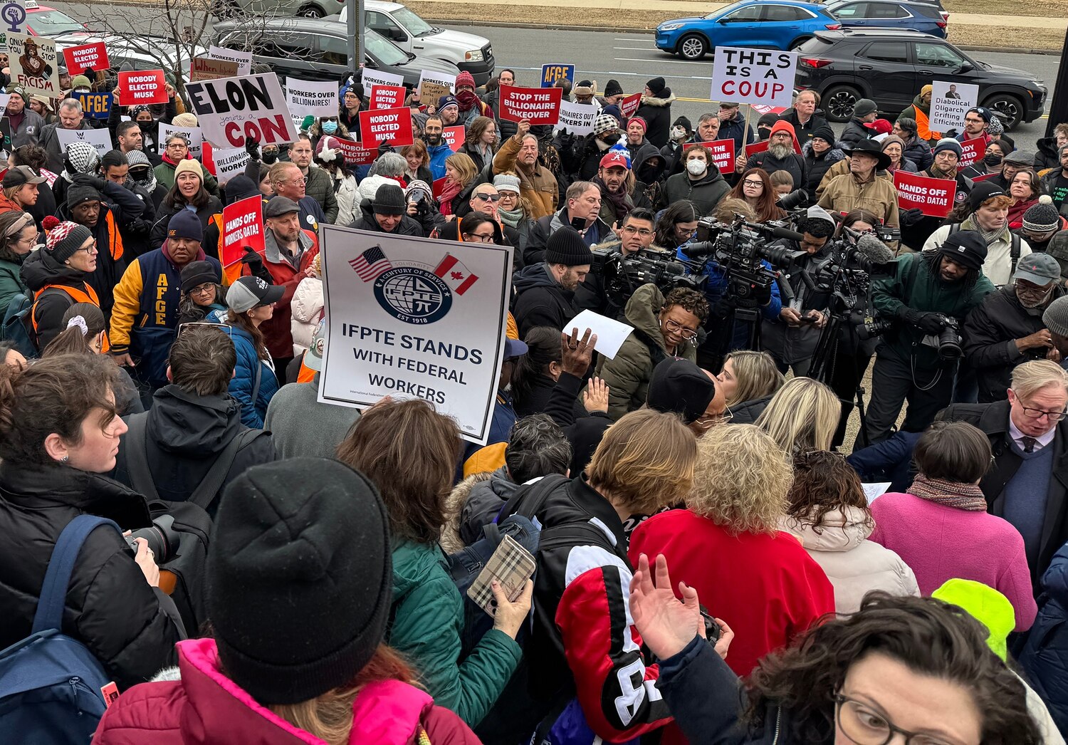 Organized by the AFL-CIO, Democratic lawmakers, and other federal employee groups, demonstrators held signs saying, "nobody elected Musk," "Elon owns Trump," and "checks and balances."