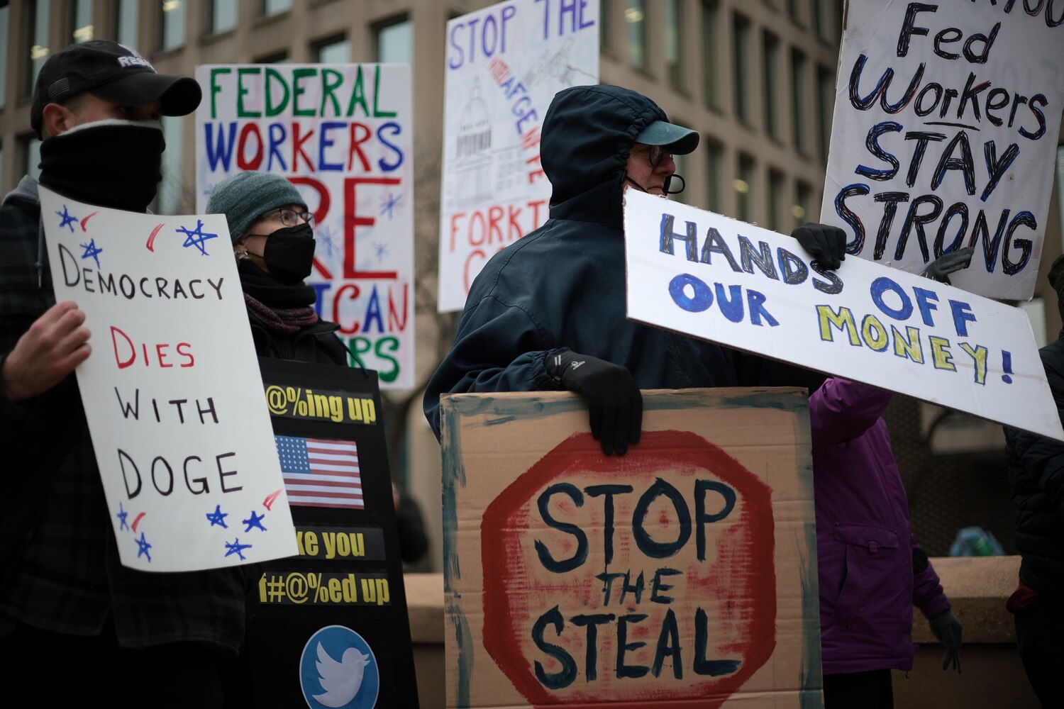 Protesters rally outside of the Theodore Roosevelt Federal Building headquarters of the U.S. Office of Personnel Management on Feb. 5, 2025, in Washington. Alex Wong/Getty Images