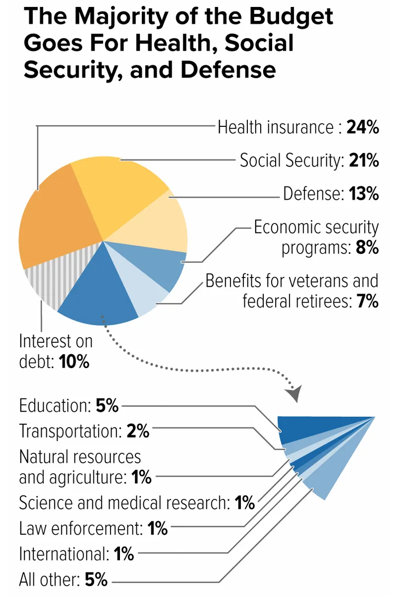 First, finding big-ticket examples of government waste is hard, because the government mostly spends money on things people want. Here’s a nice chart from the Center on Budget and Policy Priorities, showing where the money goes: