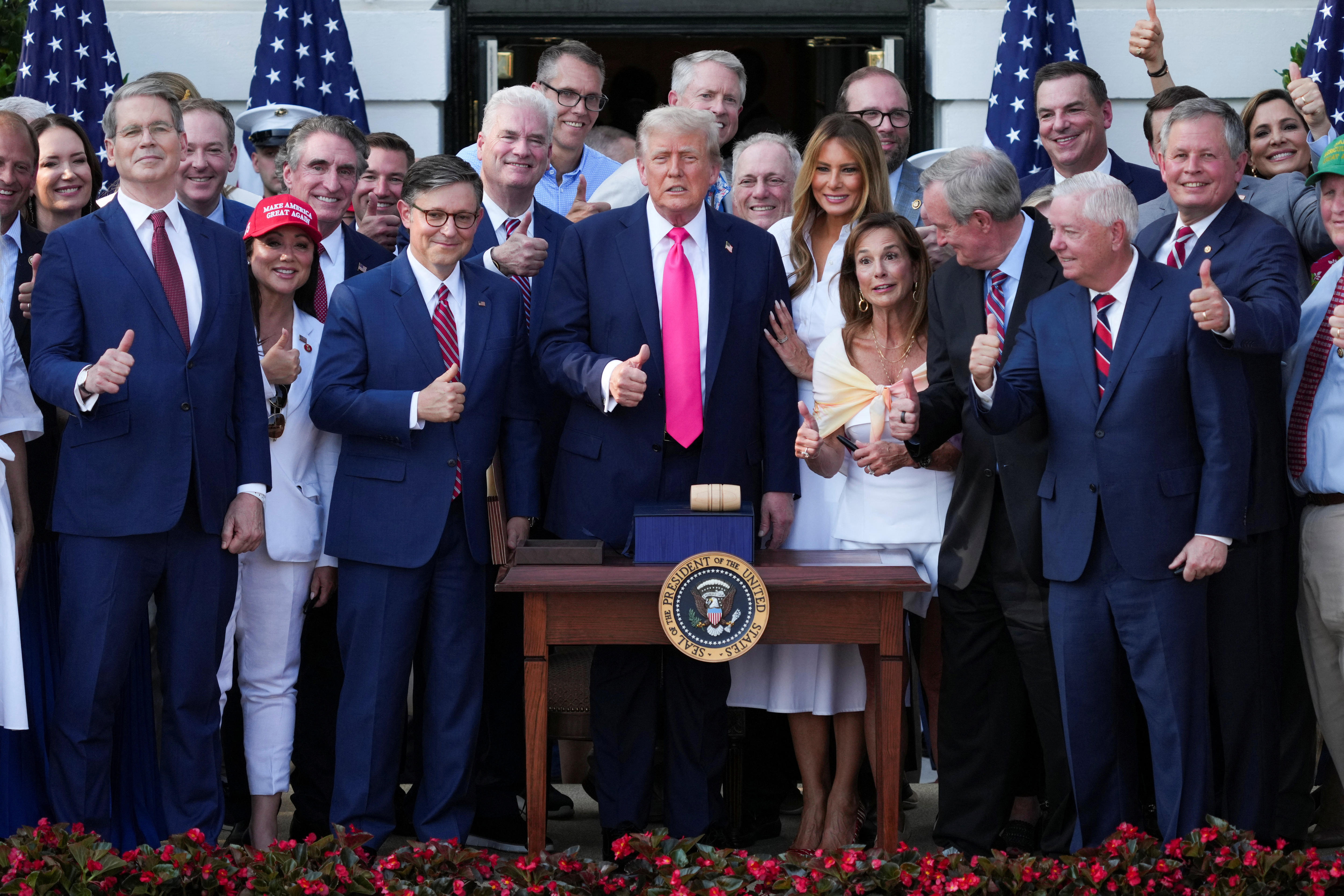 Trump poses for a group photo after he signed the "One Big Beautiful Bill Act", on July 4. (Reuters: Ken Cedeno)