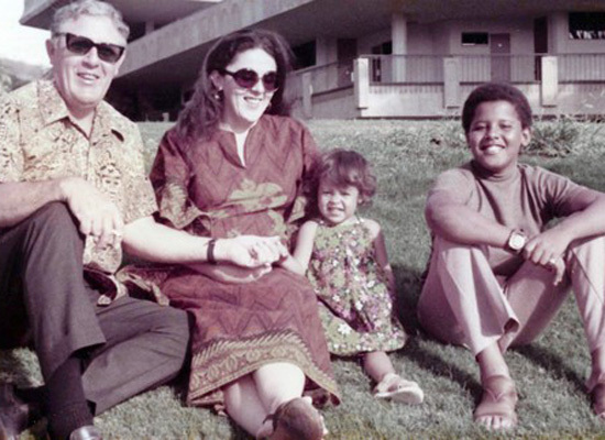 A young Obama, at right, with his grandfather Stanley, mother Ann, and sister Maya.