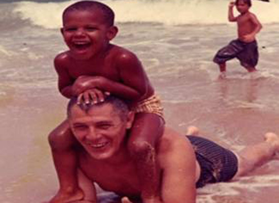 A little Obama plays with his grandfather on the beach.