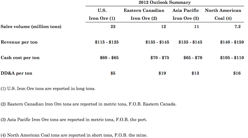 Joseph Carrabba, Cliffs' chairman, president and chief executive officer, said, "Cliffs delivered an exceptional performance in 2011, a year highlighted with the transformational acquisition of Consolidated Thompson. With a significant organic pipeline of growth in both iron ore and metallurgical coal, Cliffs is well positioned for continued momentum in 2012 and beyond."