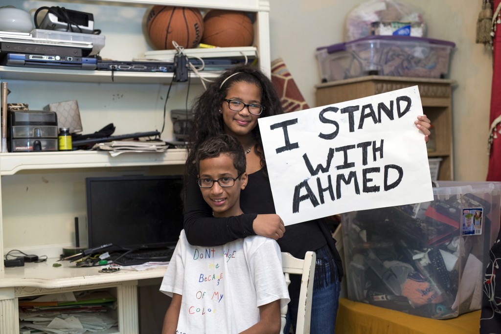 Ahmed Mohamed, a Texas Muslim teen arrested after taking his homemade clock to school, poses with his sister at their house in Irving, Texas. Photo by Bilgin S. Sasmaz/Anadolu Agency/Getty Images