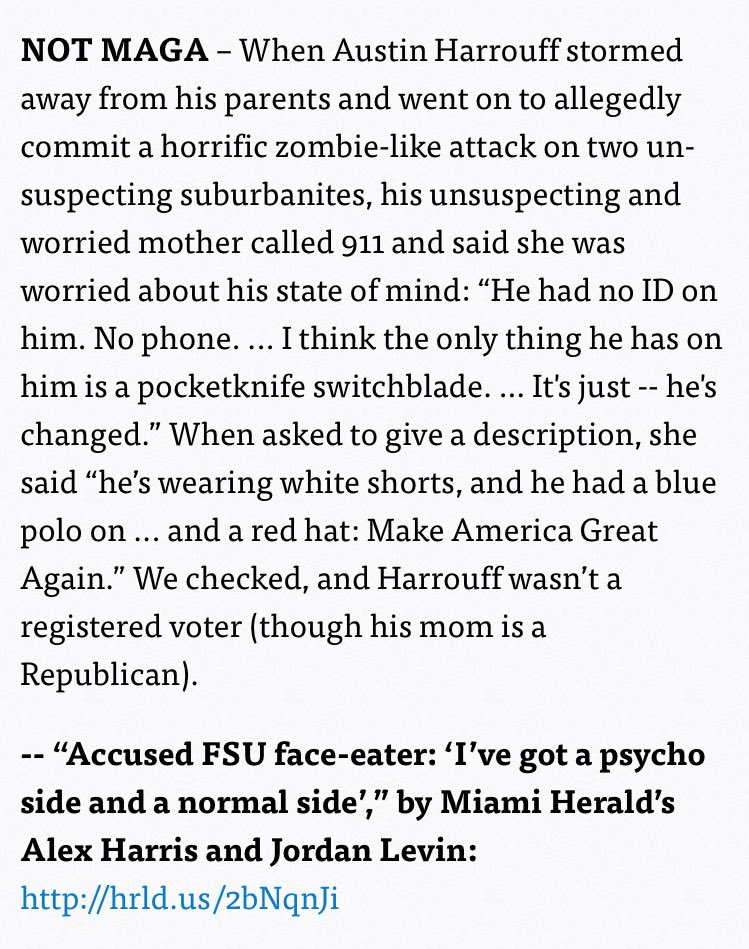 While neither of Rowe’s victims suffered life-threatening injuries, there was the curious case of the face-eating Florida man who killed two people while wearing signature Trump campaign paraphernalia this week.