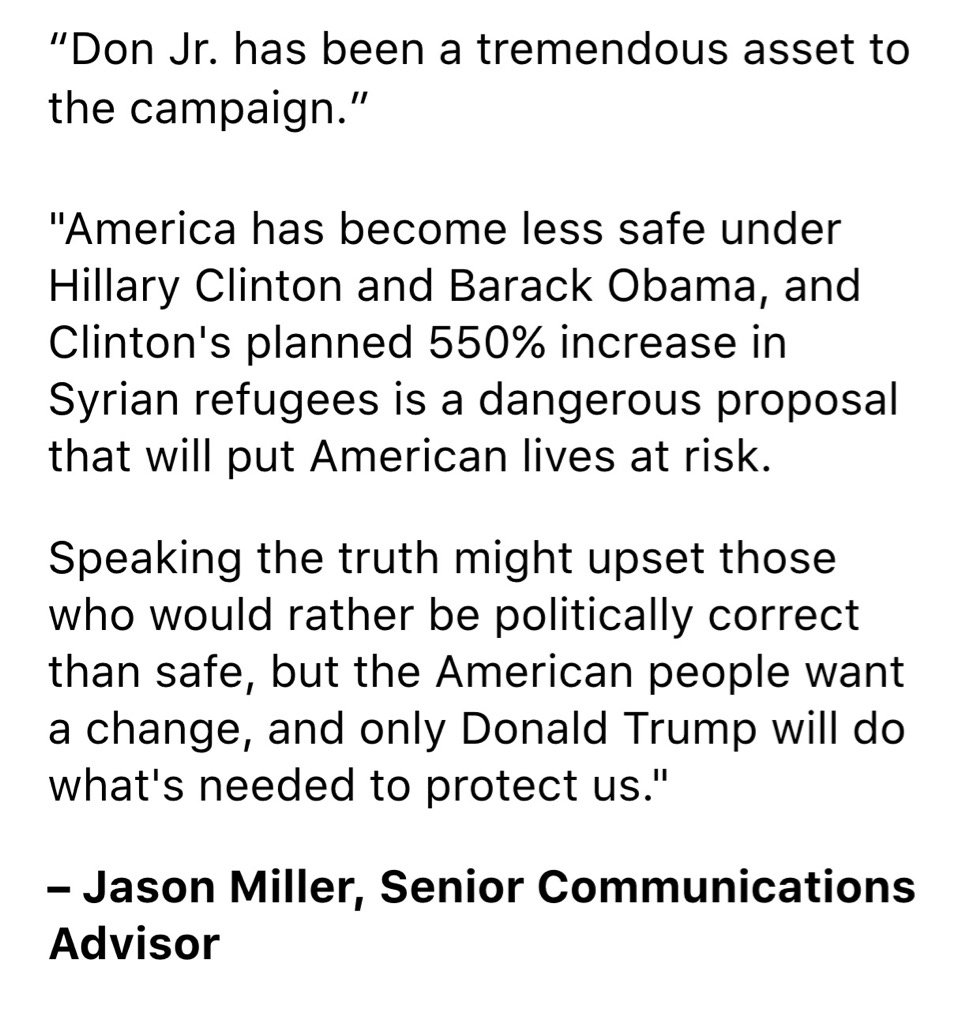 "Don Jr. has been a tremendous asset to the campaign," Trump spokesman Jason Miller said in the statement obtained by NBC News. "Speaking the truth might upset those who would rather be politically correct than safe, but the American people want a change."