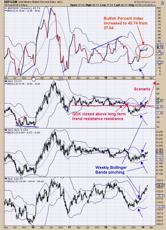 The top window is the weekly Bullish Percent index for the Gold miner’s index. The bullish percent index measures the percent of stocks that are on point and figure buy signals. The recent jump from 37.04% to 40.74% is a jump in the right direction and should see more stocks participate in the coming weeks. Back in December we pointed out the Bollinger® bands where “pinching” on GDX, GDX/GLD and GLD and suggested a large move was in the making and it turns out the large move has started to the upside. A “flag” pattern formed on the daily GDX (not Shown) that ended last week and an impulse wave up has started. Its common for “Flag” patterns to form at the half wave point of the move which would give a target on GDX near 24.50 range as the next resistance area. GDX, GLD and GDX/GLD have all been trading in a consolidation for two years and after a consolidation an impulse wave starts and it appears that impulse wave up has started that could last two years or longer, enjoy the ride. Long GDX on 1/29/19 at 21.97.
