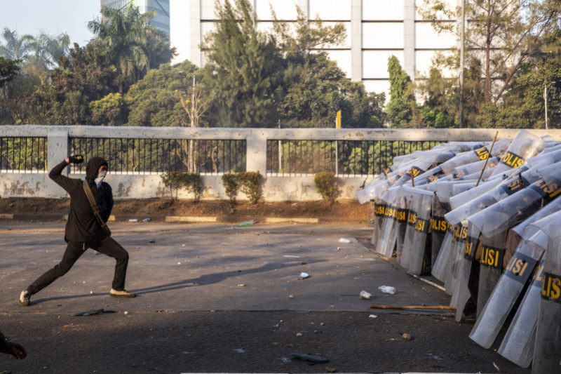 A student throws a rock at police in front of the People's Representative Council building in Jakarta. Getty Images