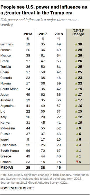 A median of 45% across the surveyed nations see U.S. power and influence as a major threat, up from 38% in the same countries during Trump’s first year as president in 2017 and 25% in 2013, during the administration of Barack Obama. The long-term increase in the share of people who see American power as a threat has occurred alongside declines in the shares of people who say they have confidence in the U.S. president to do the right thing regarding world affairs and who have a favorable view of the United States. (For more about global views toward the U.S. president and the country he leads, see “Trump’s International Ratings Remain Low, Especially Among Key Allies .. https://www.pewresearch.org/global/2018/10/01/trumps-international-ratings-remain-low-especially-among-key-allies/ .”)