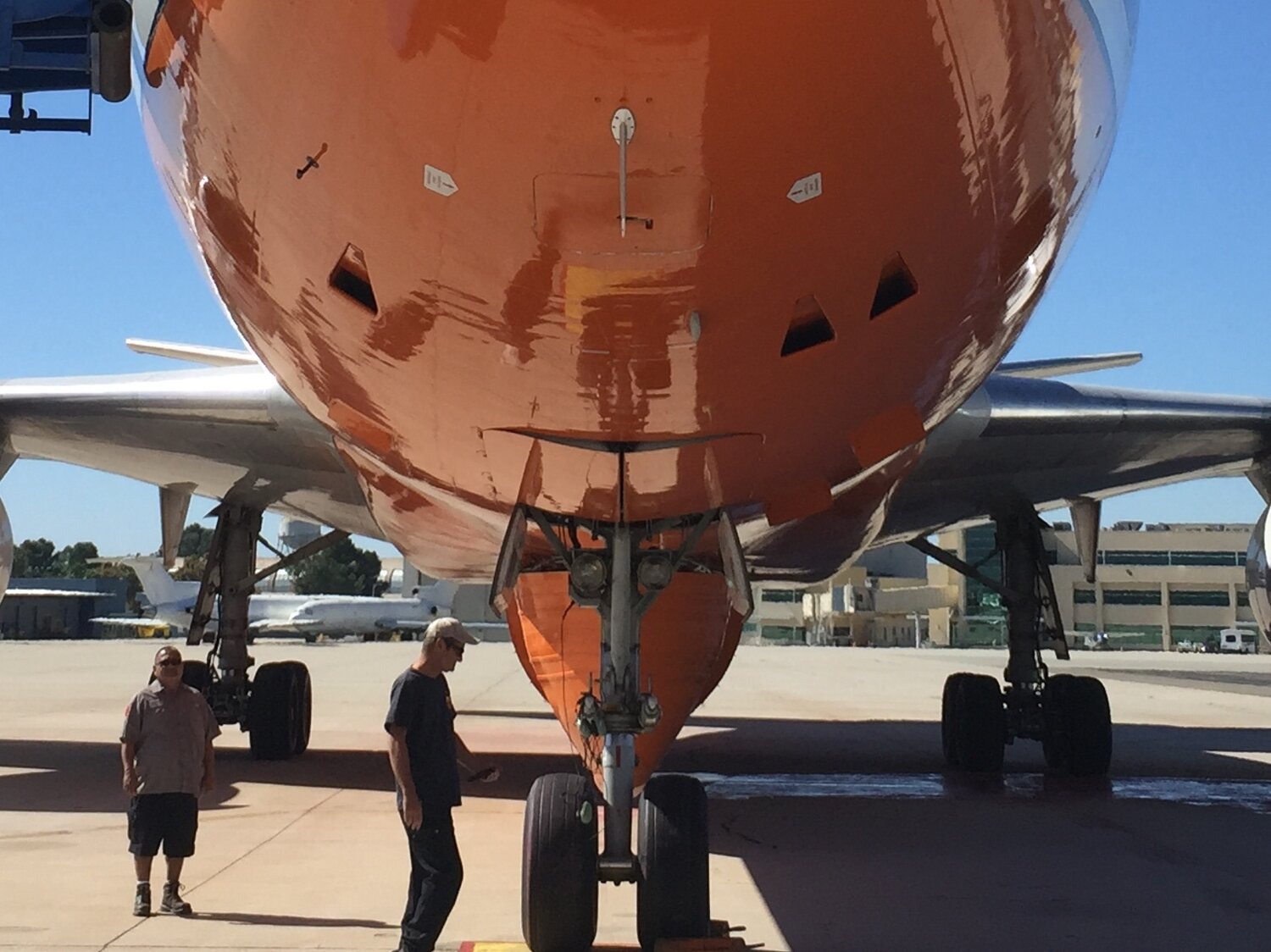 Tanker 914 is operated by the Albuquerque-based 10 Tanker. It's one of four DC-10 jumbo jets converted to fight fires. The huge planes are 181 feet long and have a wingspan of 165 feet. Fully loaded before making a drop, the aircraft can tip the scale at 420,000 pounds. Matt Guilhem/KCRW