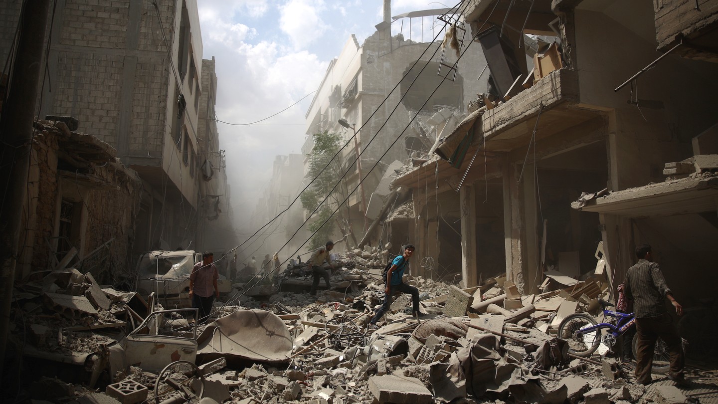 Syrians walk amid the rubble of destroyed buildings in the rebel-held area of Douma in August 2015.Abd Doumany / Getty