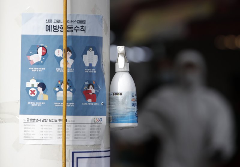 1 of 8 A bottle of hand sanitizers hangs on a pole on a street for visitors next to notices about precautions against the COVID-19 in front of a market in Seoul, South Korea, Wednesday, Feb. 26, 2020. The number of new virus cases in South Korea jumped again Wednesday and the first U.S. military soldier tested positive, with his infection and many others connected to a southeastern city where the outbreak has clustered. (AP Photo/Lee Jin-man)