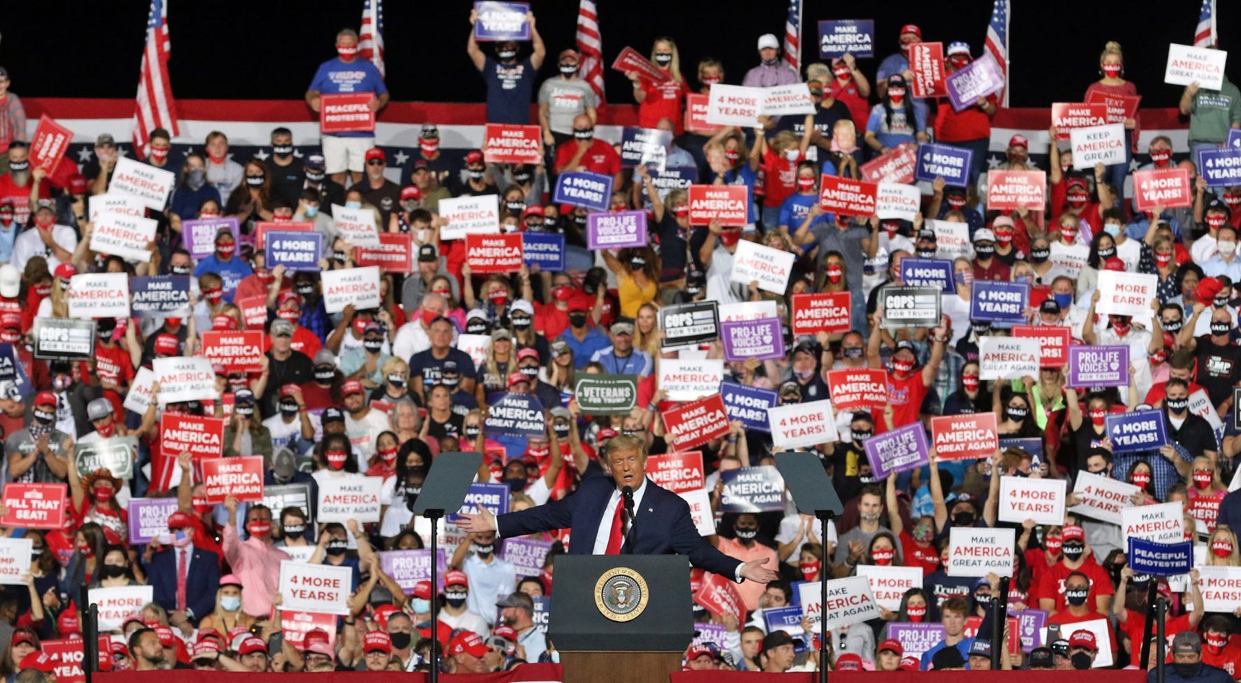 President Donald Trump speaks Wednesday evening, Oct. 21, 2020, as he held a rally outside under the stars at the Gastonia Municipal Airport in North Carolina. Mike Hensdill, The Gaston Gazette