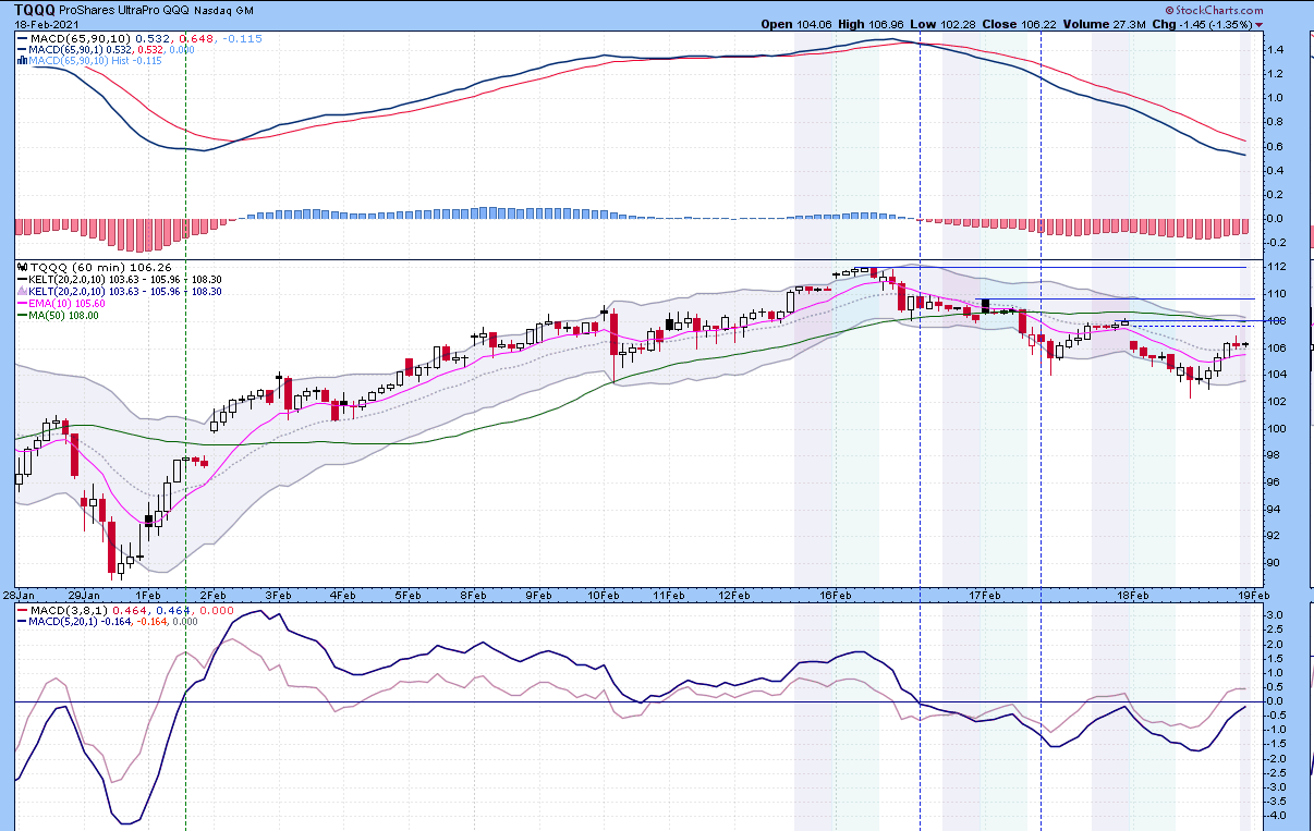 Your comment back when I posted the chart earlier this week with the AH data. Below is my current 60min chart which I just posted. On the previous chart it only showed the 2nd blue sell line. It occurred where M5 crossed under zero line on a chart without the AH data. That was yday at 106.57. Note that with the expanded hours, M5 crossed zero on Tues with price at 109. The difference is over 2%. That is sizable for sure.