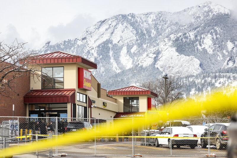 Crime tape surrounds a King Soopers grocery store on March 24 in Boulder, Colo where ten people were killed in a shooting on Monday. State Democrats now say they will consider a statewide assault weapons ban. Michael Ciaglo/Getty Images